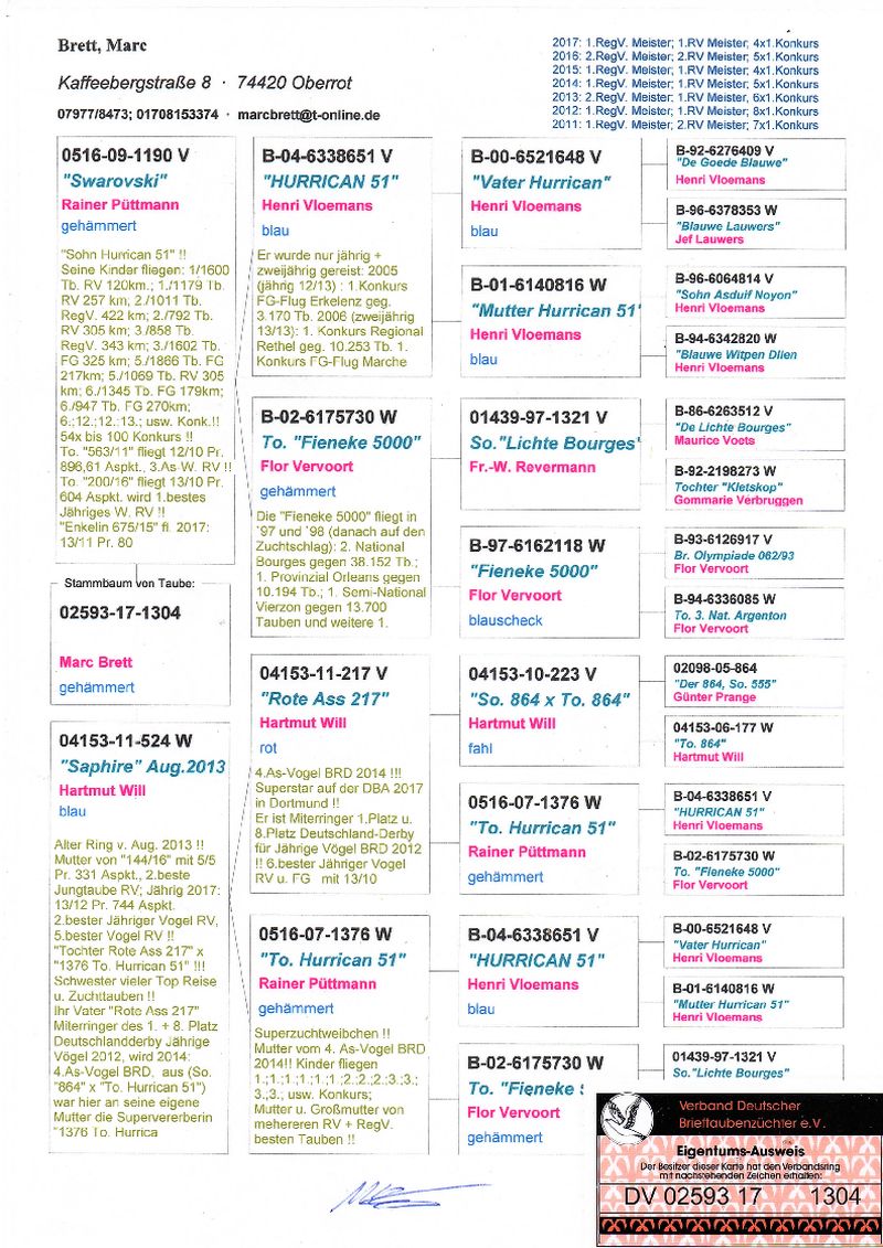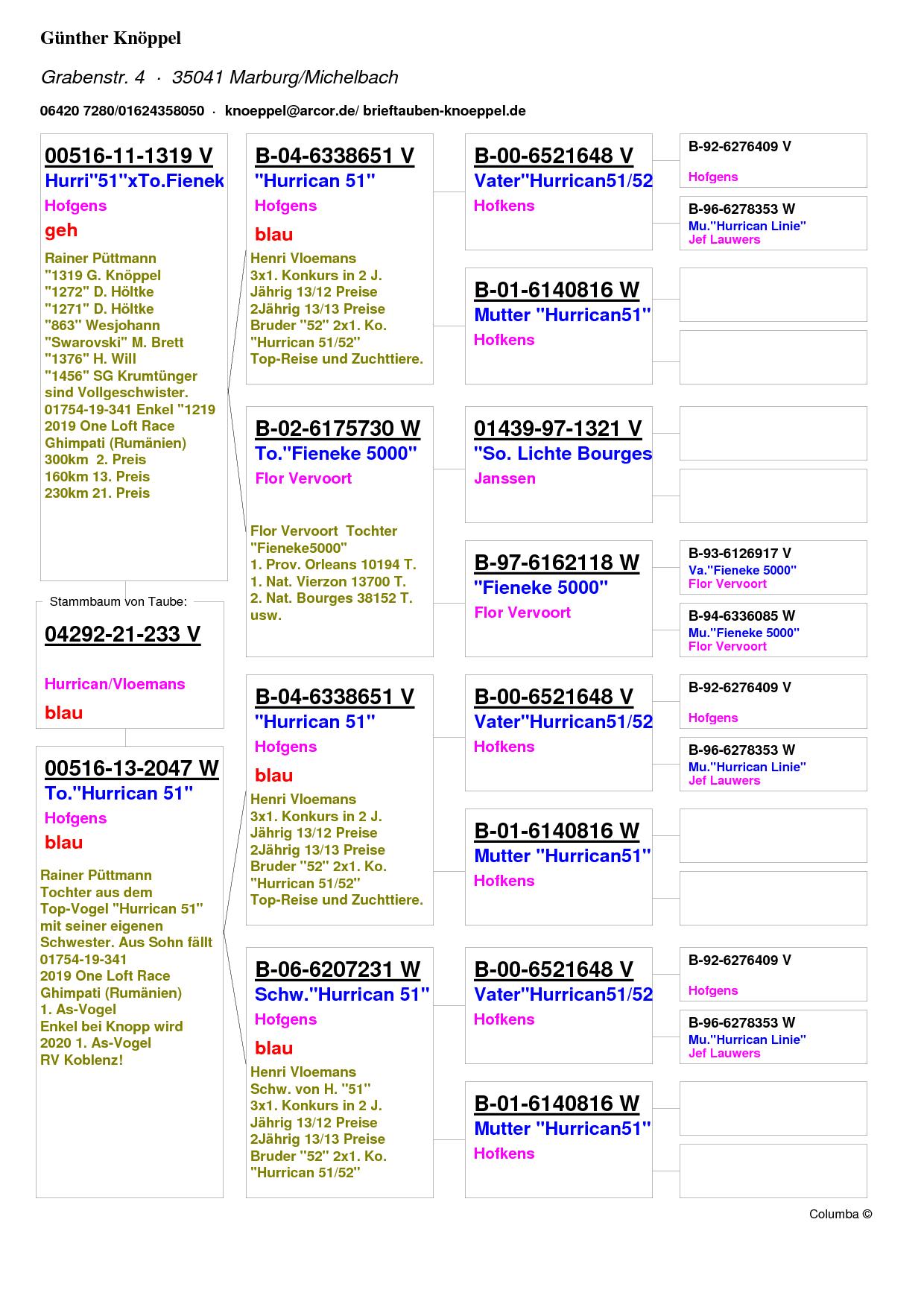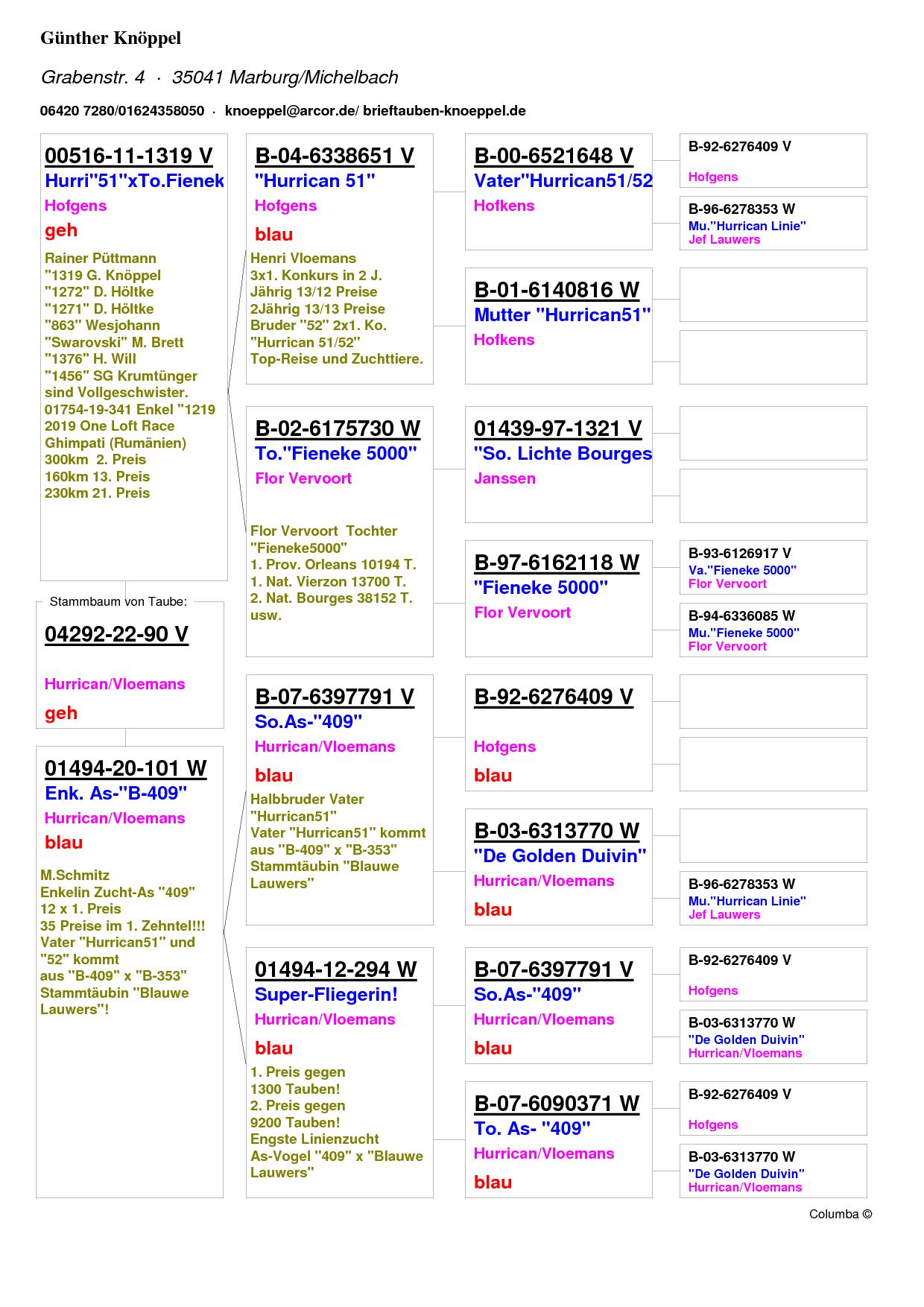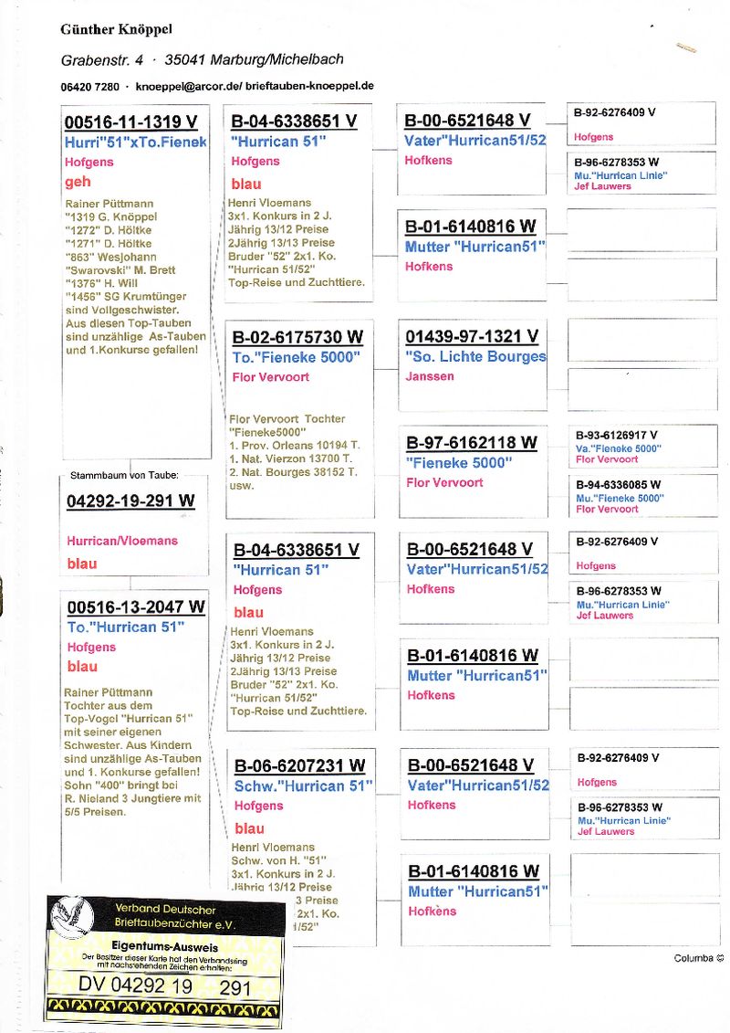 Zuchttauben mit Abstammung "Hurrican 51/52" Henri Vloeman